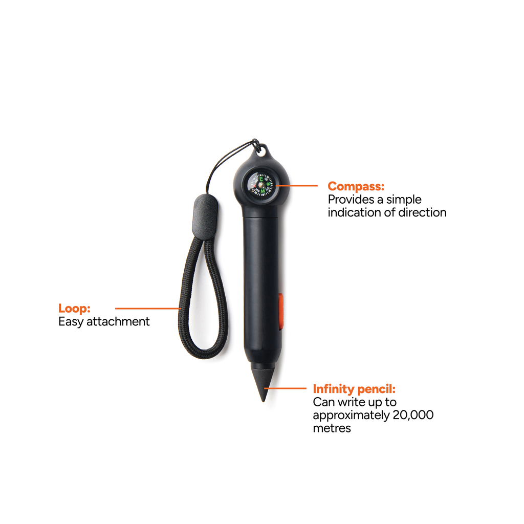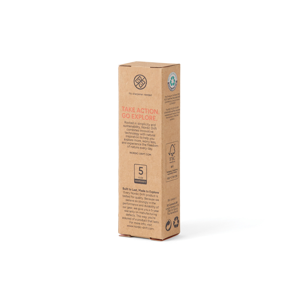 Der Nordic Drift Trial Infinity Pocket Pen hat eine Graphitspitze, die sich zum Schreiben mit dem orangefarbenen Knopf herausziehen und zum Schutz wieder in den Schaft zurückziehen lässt . Mit einer Schlaufe an der Oberseite um ihn an einem Rucksack befestigt zu können. Herkömmlichen Holzstifte schreiben etwa 200m, doch reicht die Graphitspitze dieses Infinity-Stifts schreibt für etwa 20.000m. Er schreibt wie ein normaler Bleistift und die Graphitmarkierungen können radiert werden, während sich die Spitze nur sehr langsam abnutzt. Der Stift besteht aus RCS-zertifiziert recyceltem ABS und hat einen kleinen Kompass. Der Stift ist in einer FSC®-zertifizierten Verpackung ohne Kunststoff verpackt. Alle Produkte von Nordic Drift werden auf ihre Qualität geprüft. Da wir von der Leistungsfähigkeit & Langlebigkeit unserer Produkte überzeugt sind, gewähren wir auf jeden Artikel eine 5-jährige Garantie auf Herstellungsfehler. Ausführliche Informationen finden Sie unter www.nordic-drift.com.
